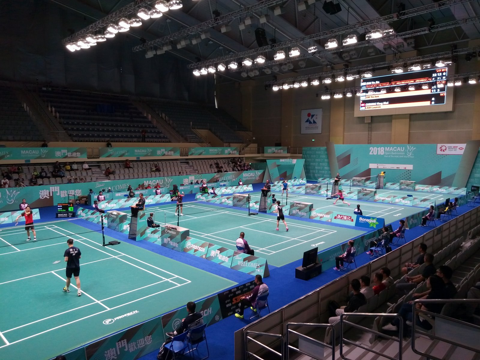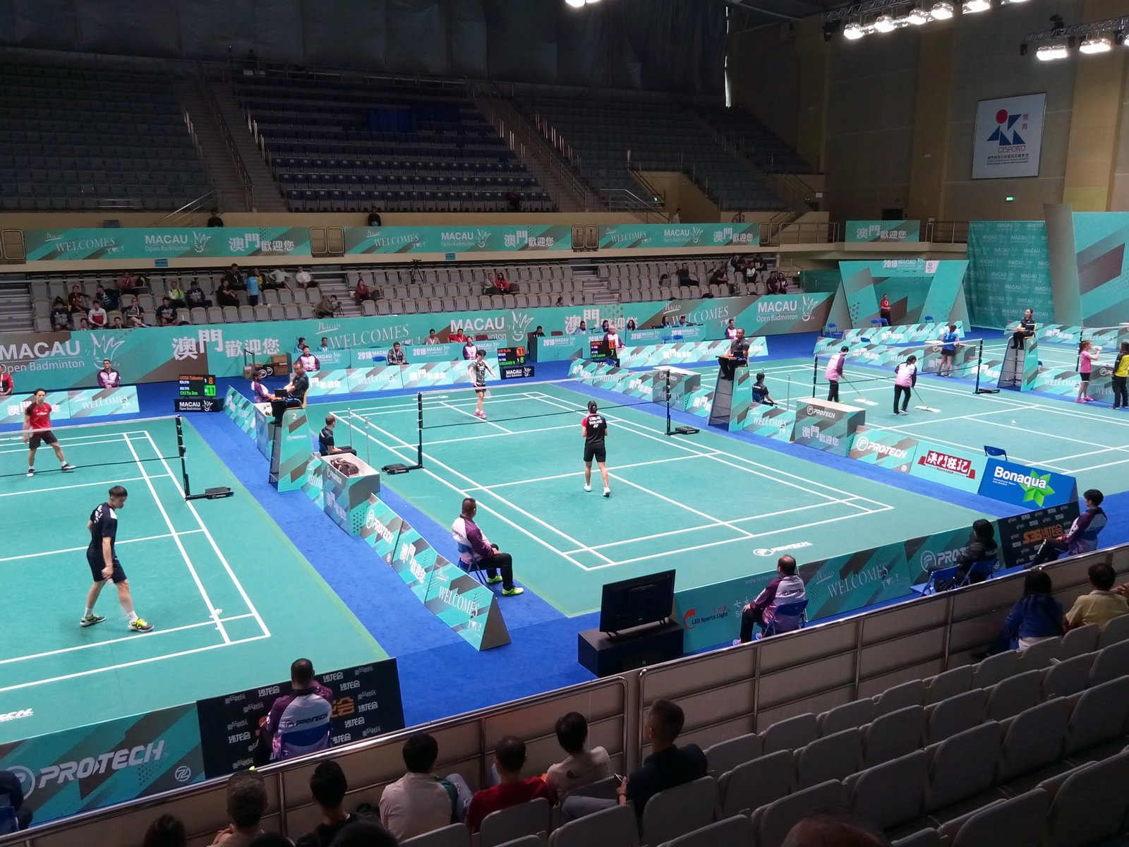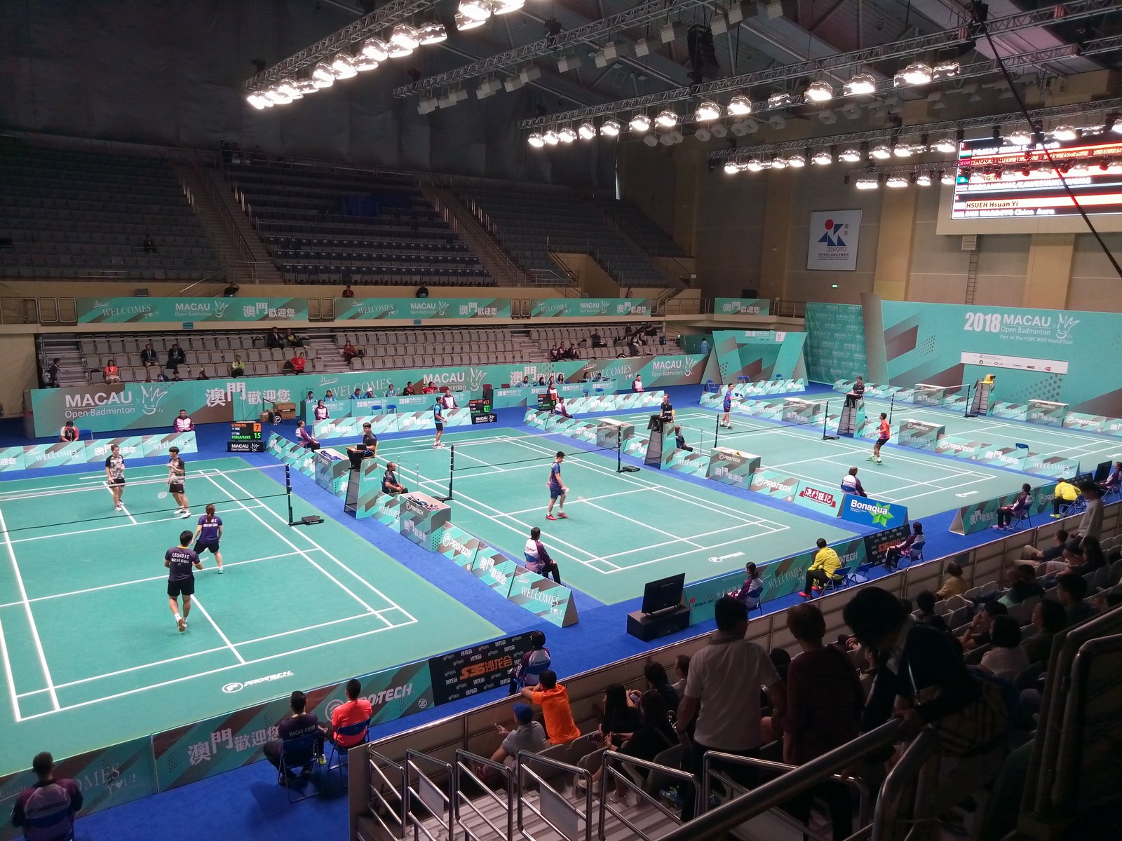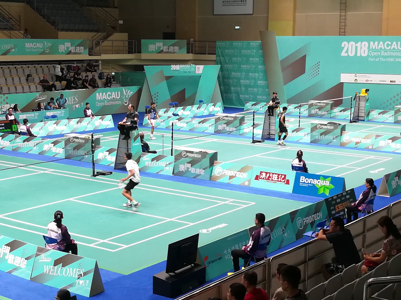 今天迎来2018澳门羽毛球世界羽联巡回赛开赛第一天,也是赛程最密集的一天,全天从早上9点开始进行预选赛及64强赛。男单、女单、男双、女双和混双的选手悉数登场,在塔石体育馆内的4片场地内展开捉对厮杀。